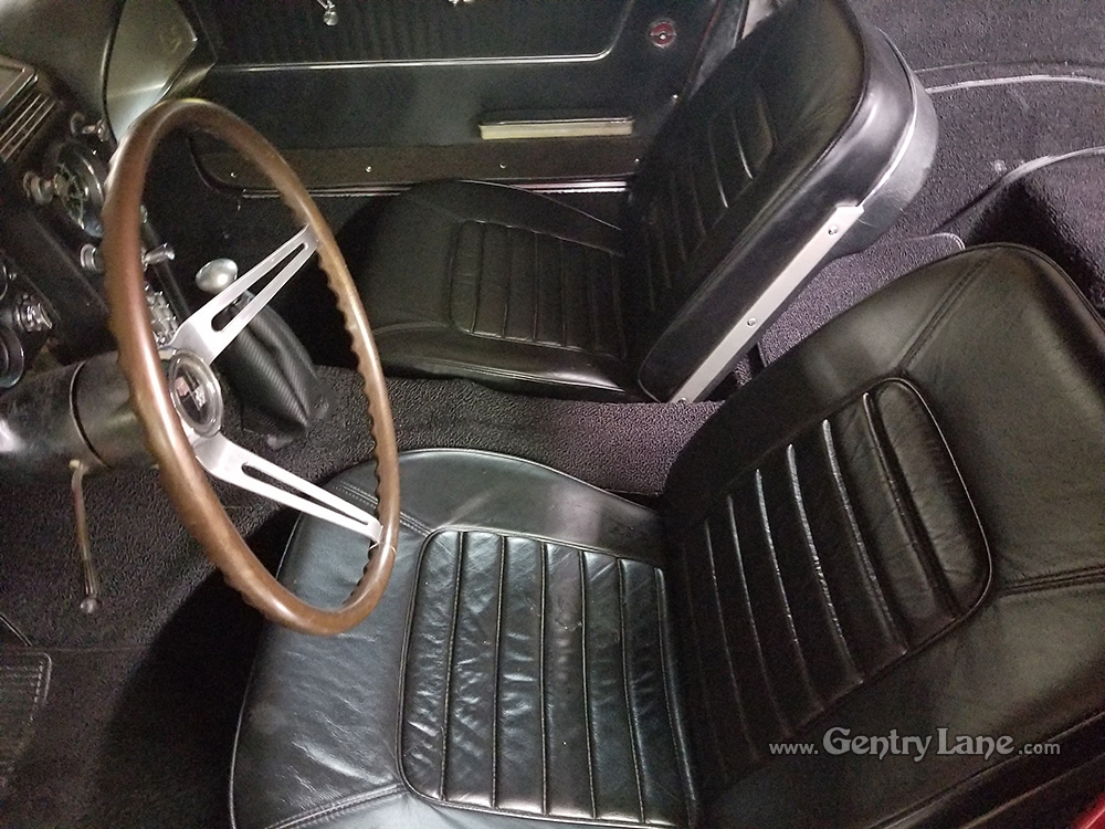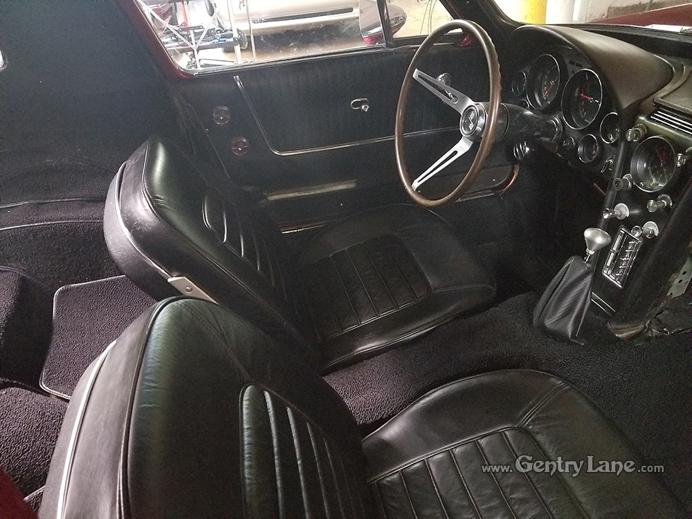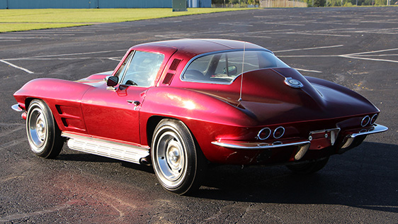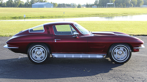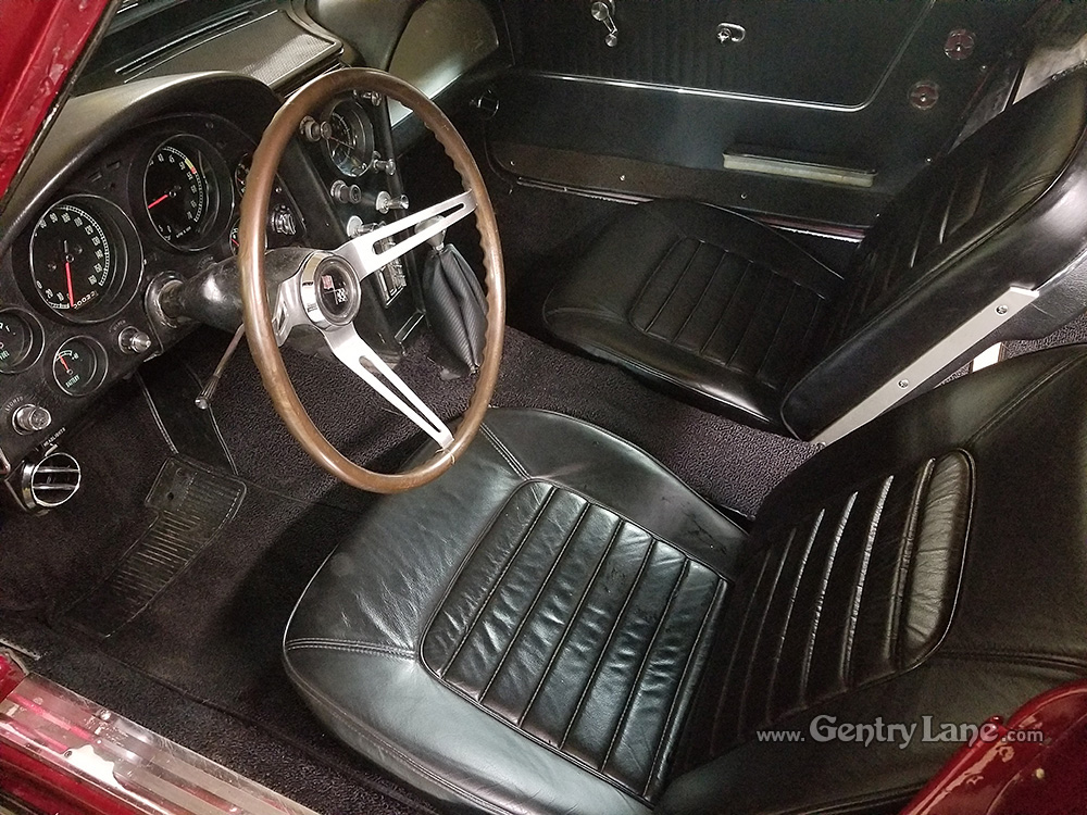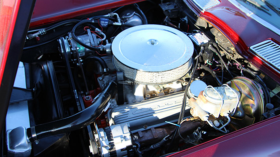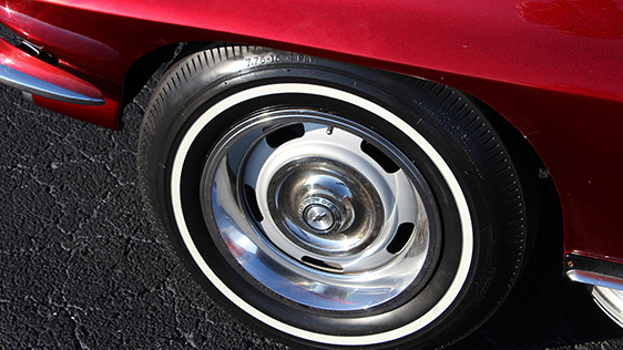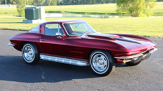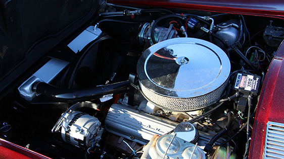1964 Chevrolet Corvette Sting Ray. The exterior is Red with a Black interior. General Motors THM 350 – 3 Speed Automatic, V-8 engine. Side pipe exhaust system. 1967-style Corvette Rally wheels. Modern steering wheel. Whitewall tires. 1967-style “stinger” hood. Non-factory dual sport-style mirrors. Power brakes. Radio. Air conditioning.