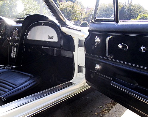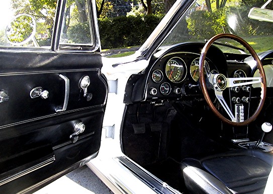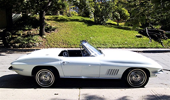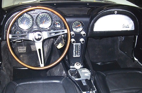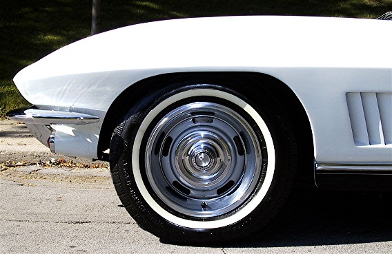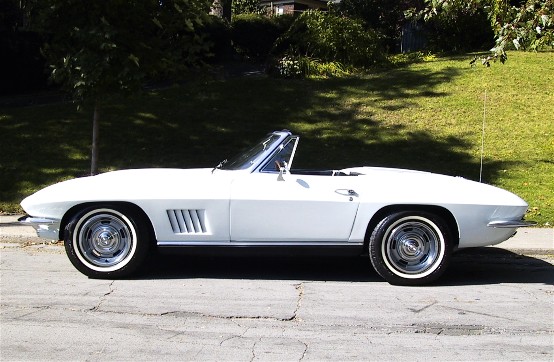 Some consider the ’67 the best looking Vette of all time. It’s styling, although basically the same, was cleaner and it had five functional front fender louvers. Minor changes were made to the interior. The most noticable was the relocation of the parking brake from under the dash to the center console. This ’67 comes equiped with – rally wheels, 4-wheel disc brake, odometer, clock, carpeting, wheel trim rings, tachometer, and all vinyl, foam cushioned bucket seats.