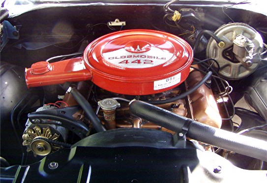 Oldsmobile was the first GM division to follow Pontiac’s lead, and began to offer fullsize muscle in its midsize Cutlass model. The package included the top engine available from Oldsmobile, a 330 cid V8 with the police package. It was named the 4-4-2 package, originally signifying the engine’s 4 barrel carb, 4 speed manual transmission, and dual (2) exhausts.