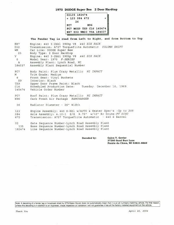 High quality, correct restoration 1970 Dodge Super Bee 2 Door Hardtop. Fitted to this car; a NUMBERS MATCHING 440 Six-Pack with RAMCHARGER. The transmission is the factory A727 Torqueflite Automatic Column shift. Also fitted with a rare Dana 4.10 Super Drag Pack. The exterior has been painted to the original Plum Crazy with all the correct decals and emblems. High Dollar, no expense spared restoration on this appreciating Classic Mopar. Solid example, great investment value.