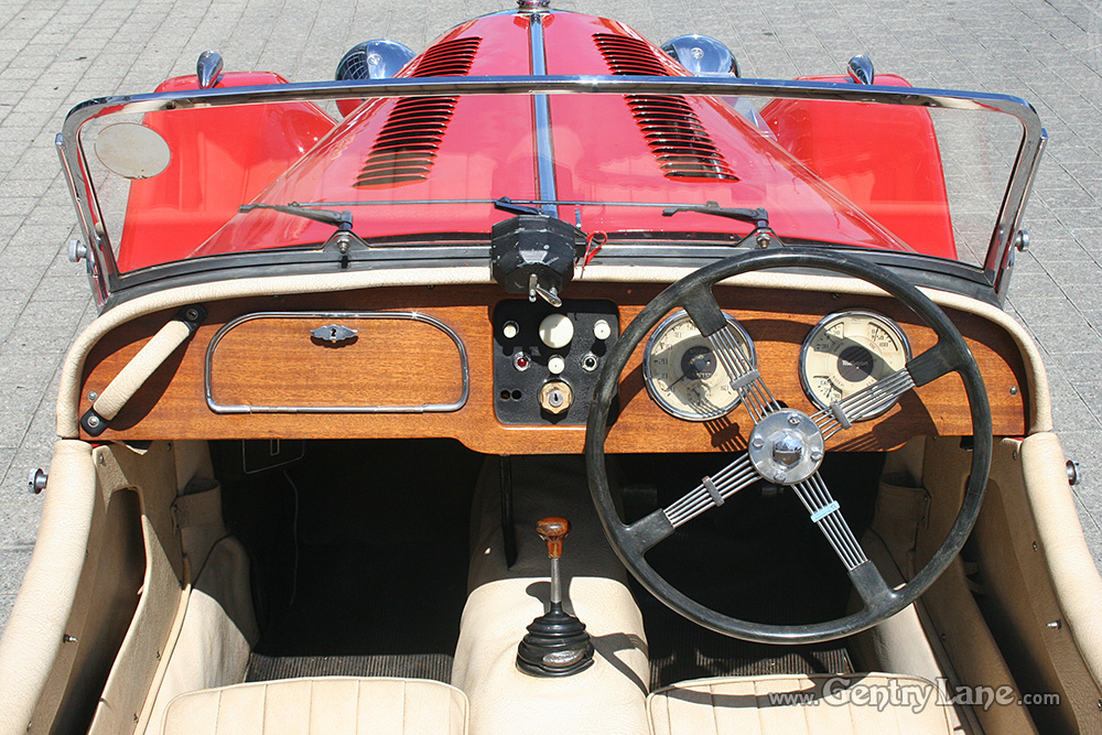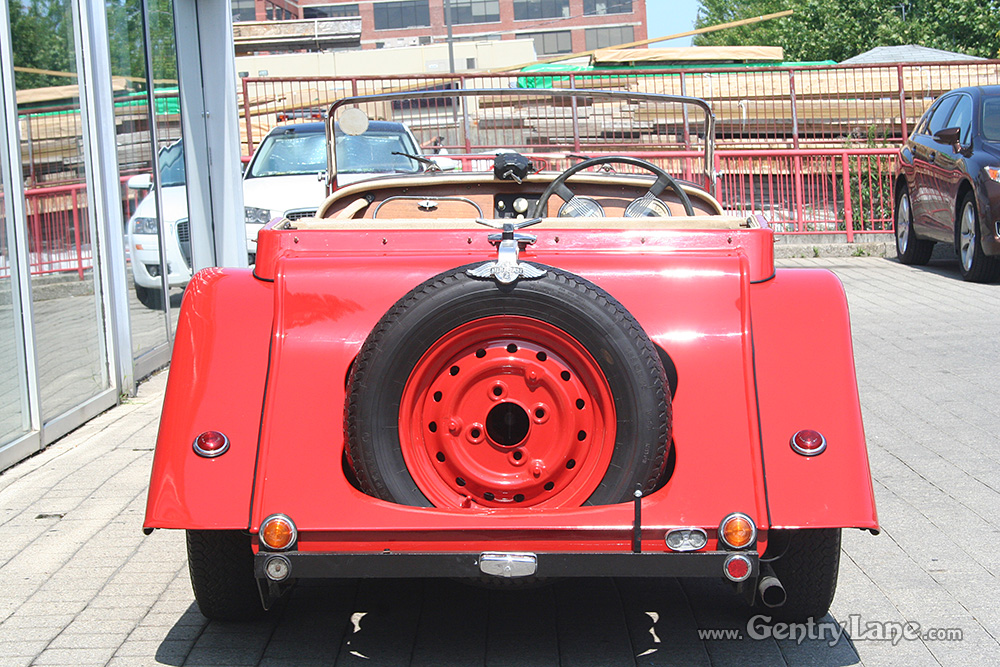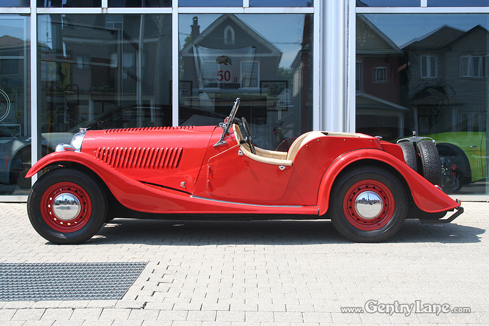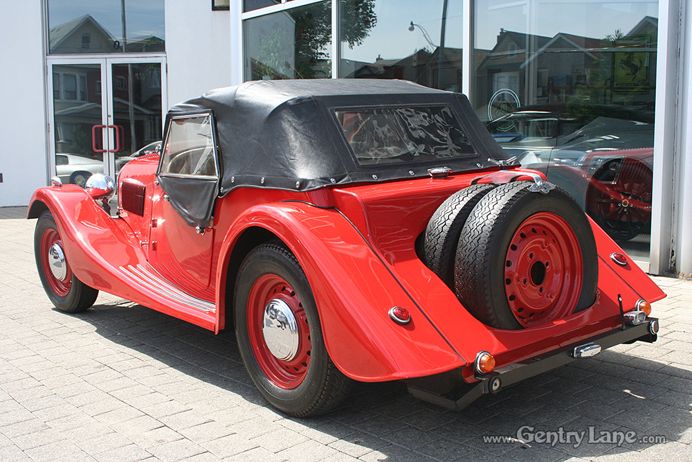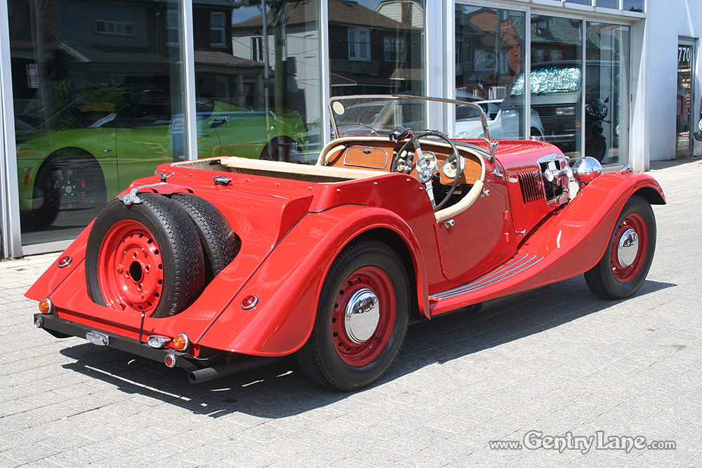 1952 Morgan Plus 4. The outside is Red with a Beige leather interior. Manual transmission with an Inline four cylinder engine. 1991 cc. Right hand drive. Convertible with a black soft top. Duel Carburetors. Flat grill. Banjo steering wheel. Twin rear mount spares. Genuine British roadster experience that is rapidly increasing in value.