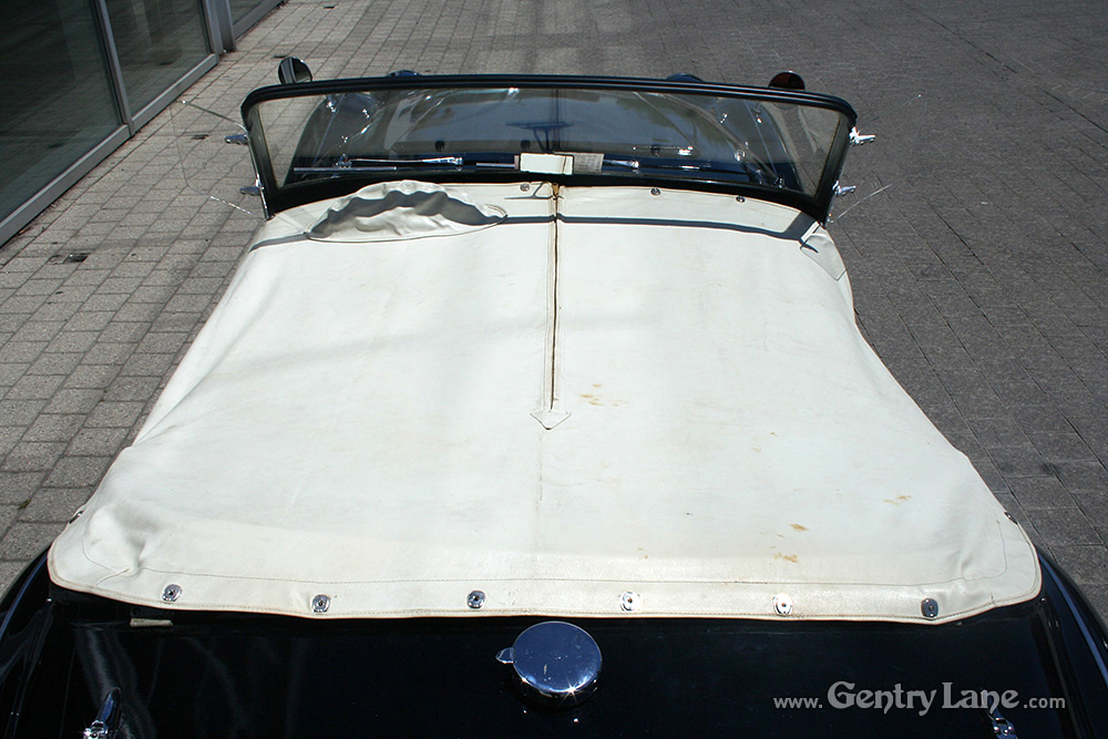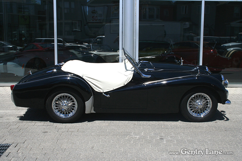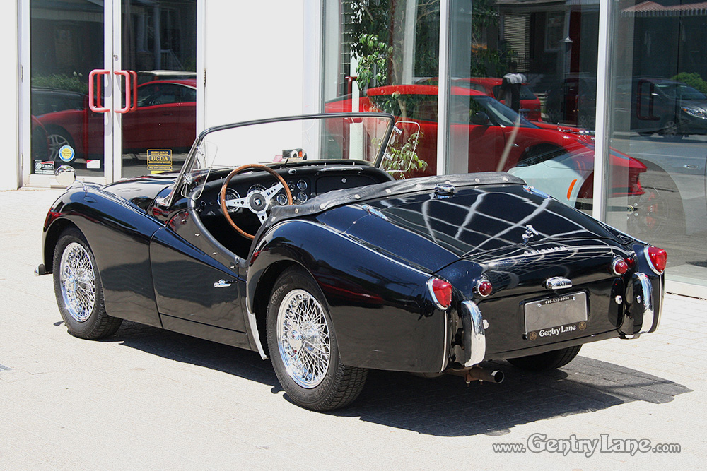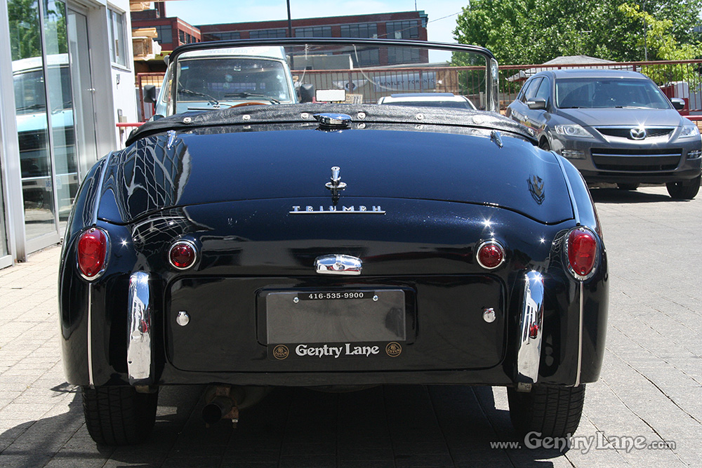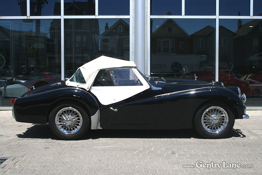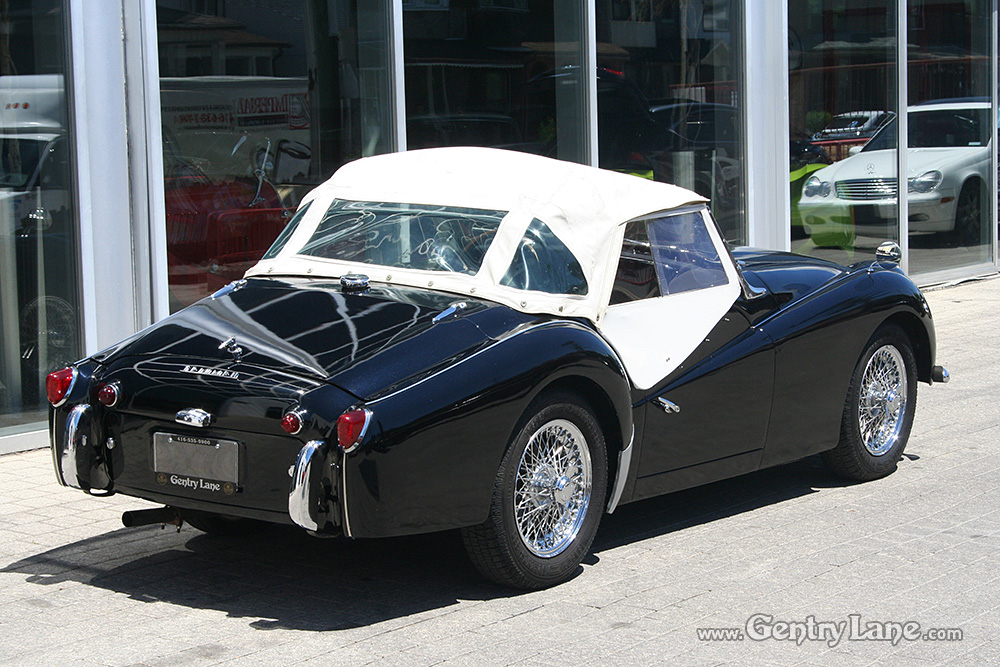 1959 Triumph TR3 Roadster. This is one delightful British Classic Roadster. The exterior is black with a black interior accented with white piping. Comes complete with a white soft-top and matching side curtains, black soft-top frame boot and white full tonneau cover.