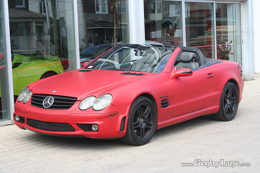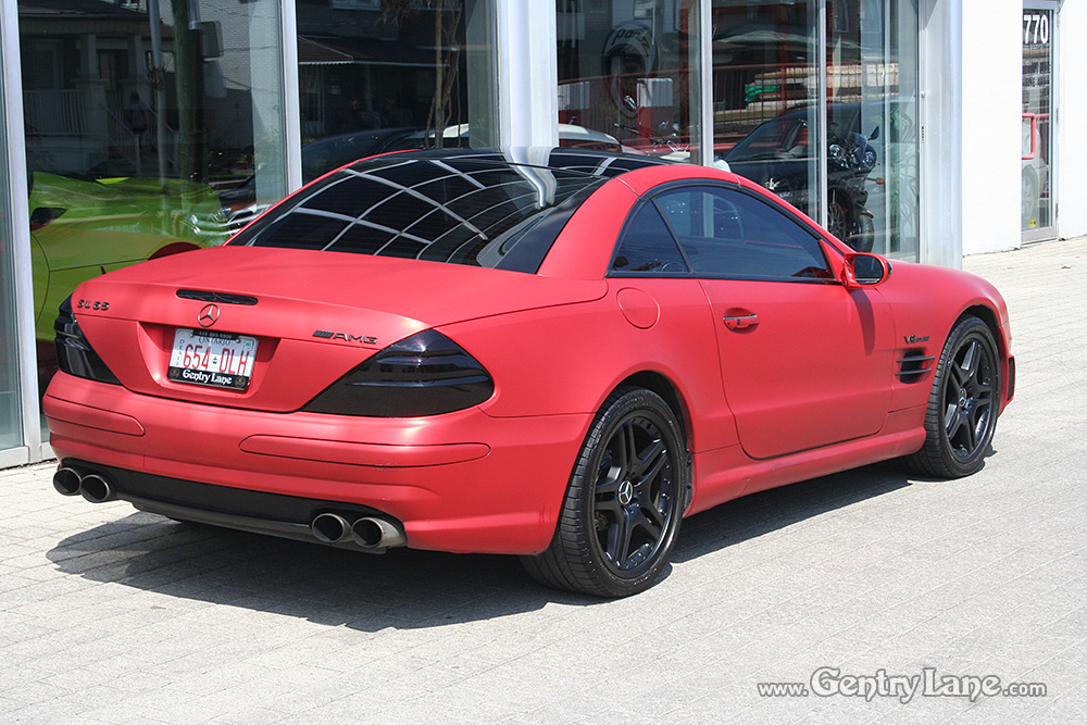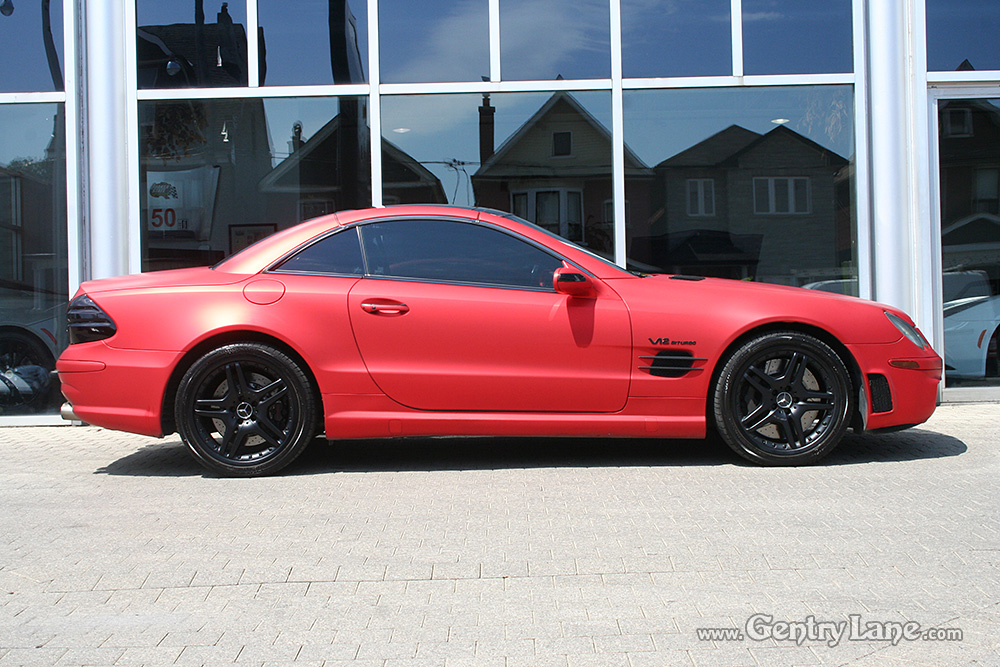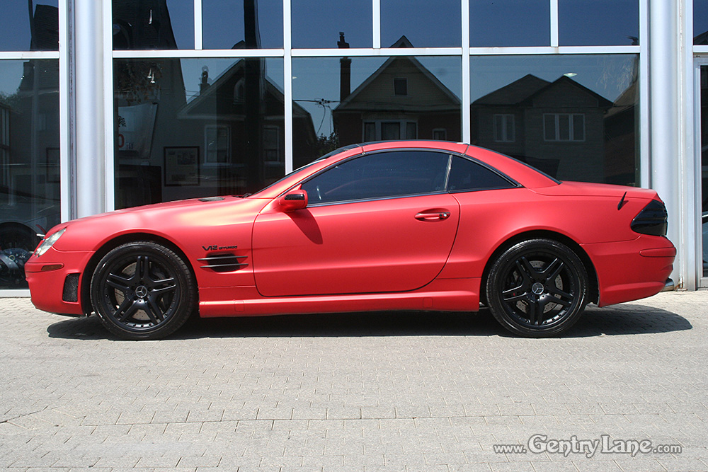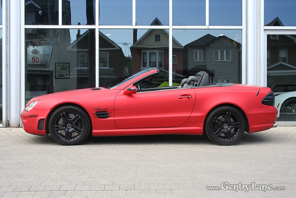2005 Mercedes-Benz SL65 AMG V12 Twin Turbo. The exterior is Black with a Matte Red wrap. Black interior. Hard top convertible. 5-Speed Automatic. 119,000 km. RWD. 6.0L V12 SOHC 36V Turbocharged. Options include power windows, power seats, radio, CD player, A/C.