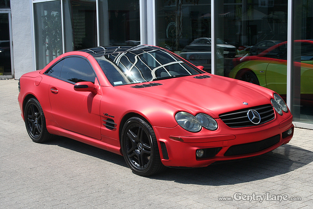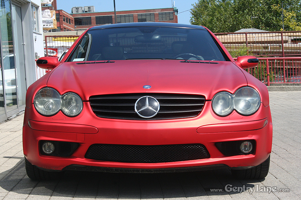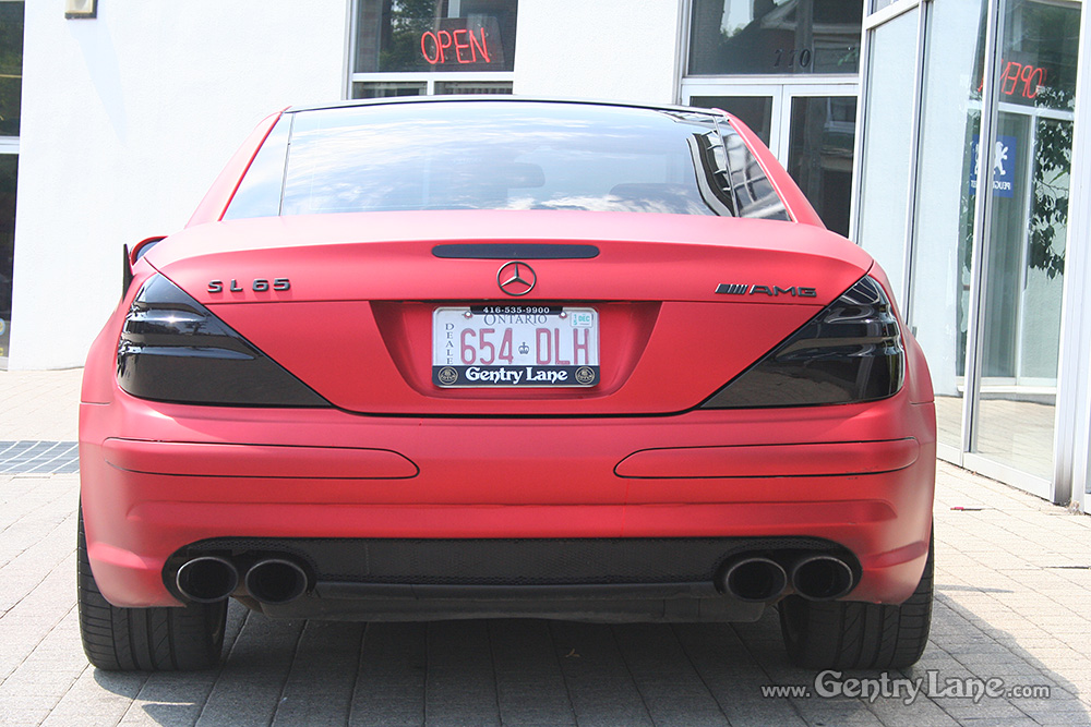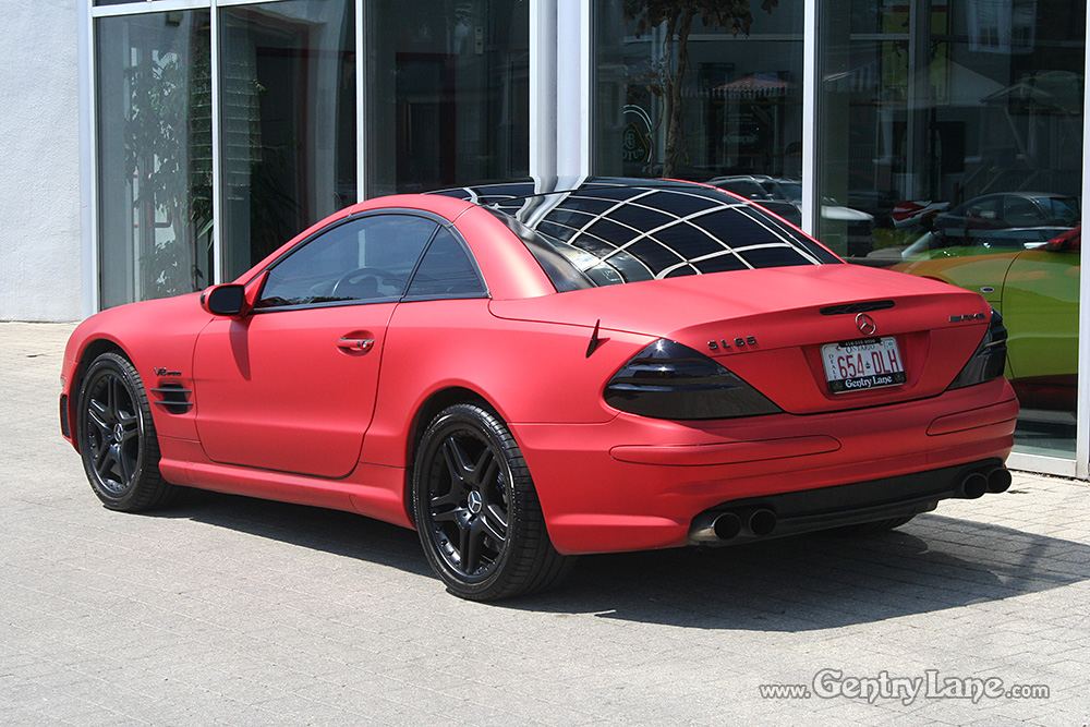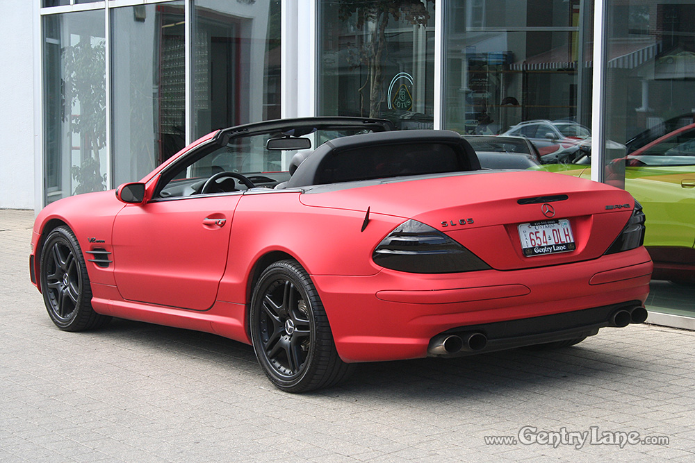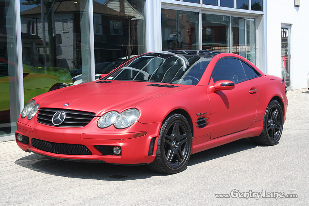 2005 Mercedes-Benz SL65 AMG V12 Twin Turbo. The exterior is Black with a Matte Red wrap. Black interior. Hard top convertible. 5-Speed Automatic. 119,000 km. RWD. 6.0L V12 SOHC 36V Turbocharged. Options include power windows, power seats, radio, CD player, A/C.