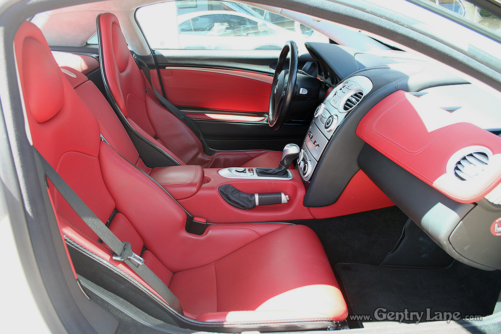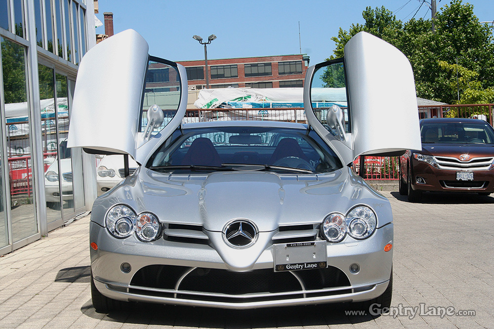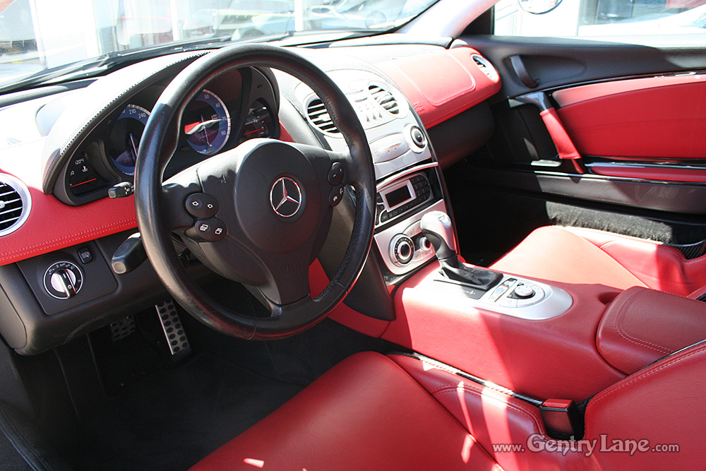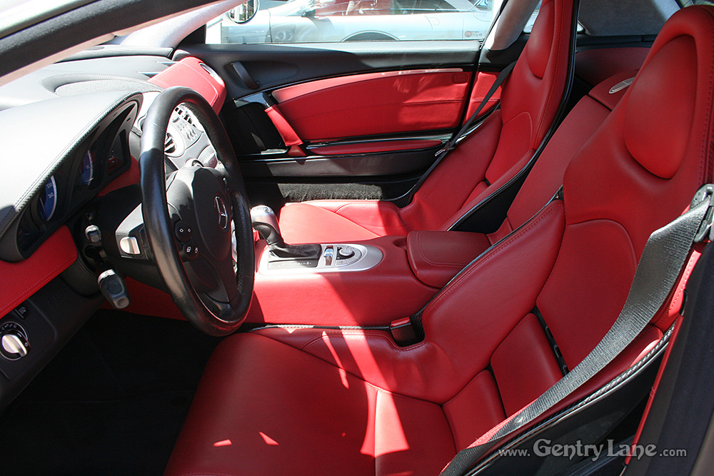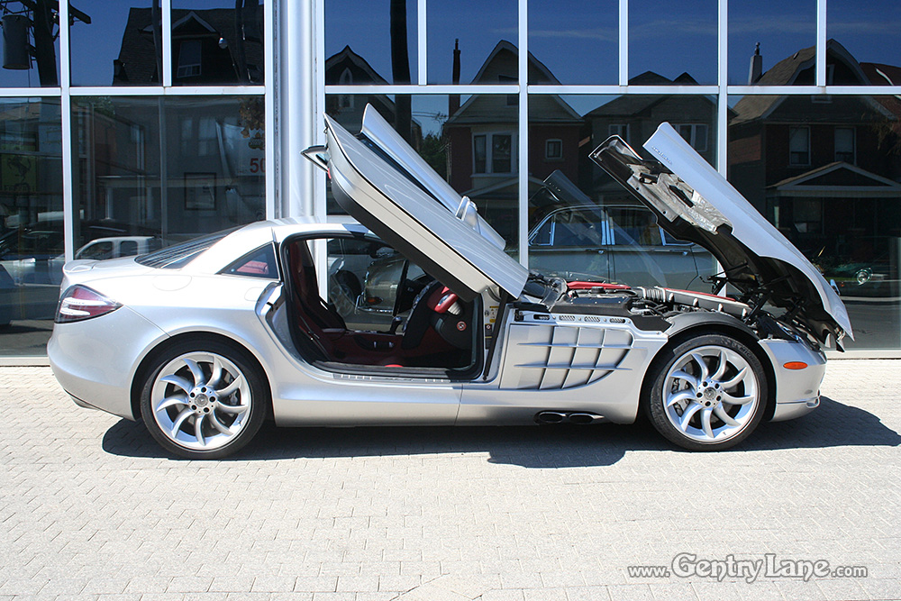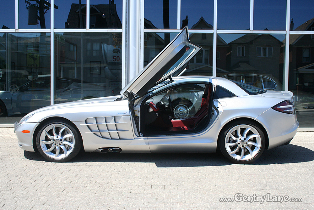 Beautiful 2005 Mercedes-Benz SLR McLaren in Crystal Laurite Silver over a Red leather interior with 29,100 km. 617-hp 5.4L V-8 Engine. 5 speed automatic transmission. RWD. Gullwing doors. Options include tilt and telescope steering, cruise control, navigation system, rain sensing wipers, power locks, power windows, power seats, power and heated mirrors, radio, CD player and air conditioning.