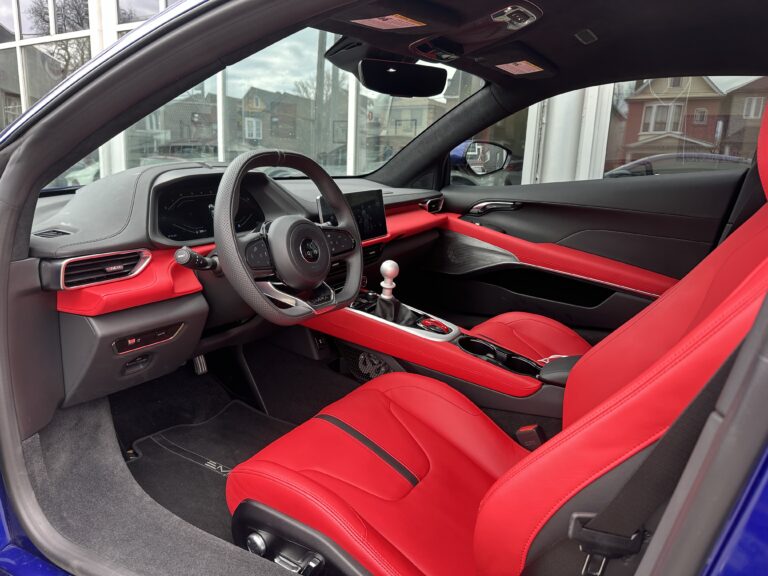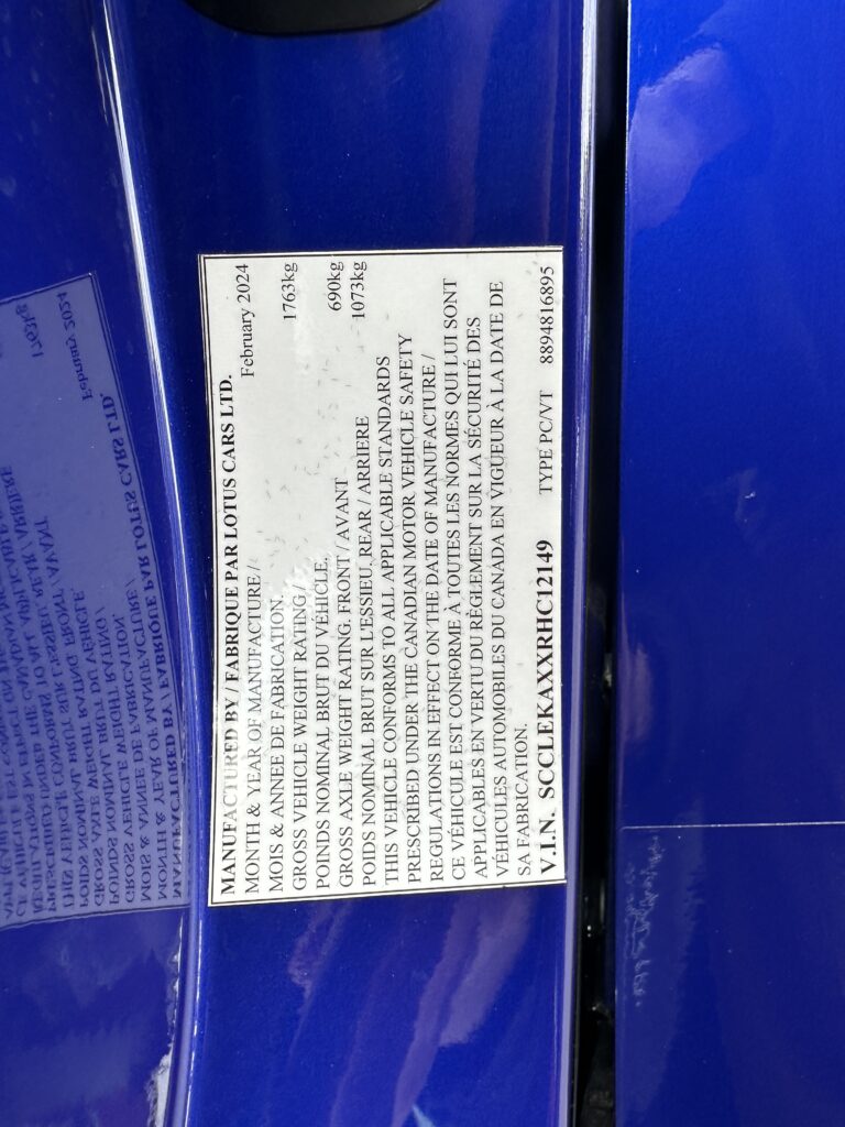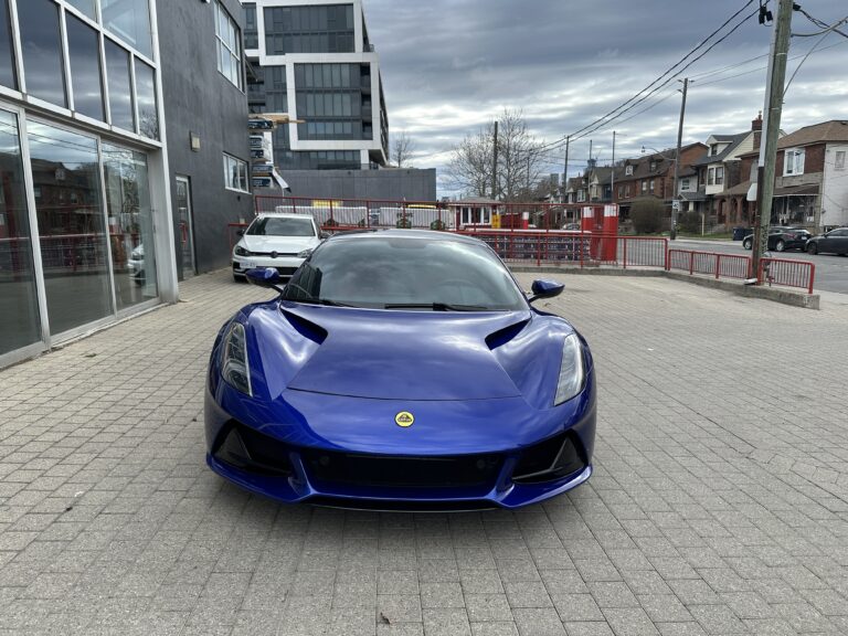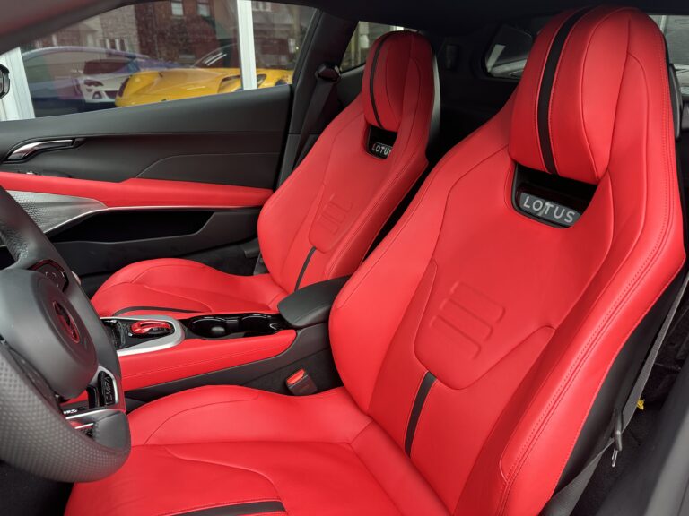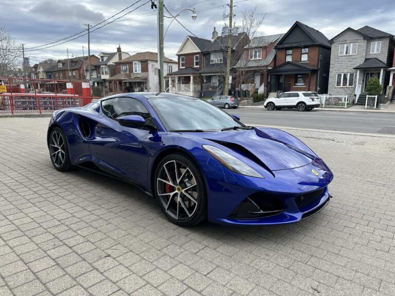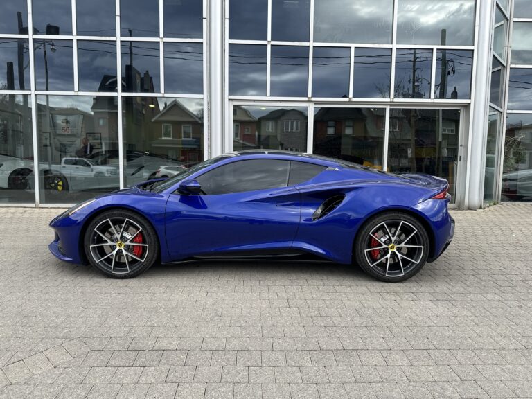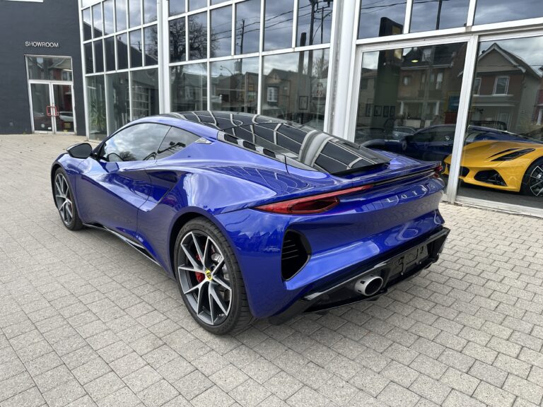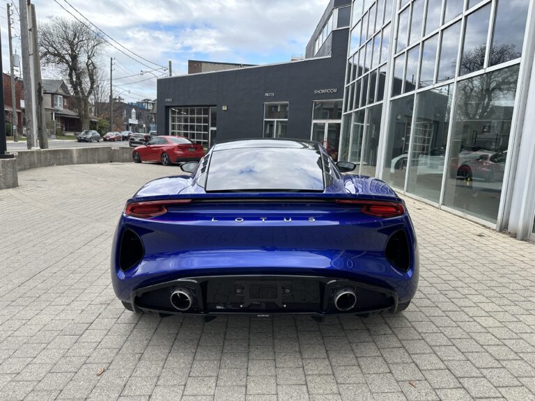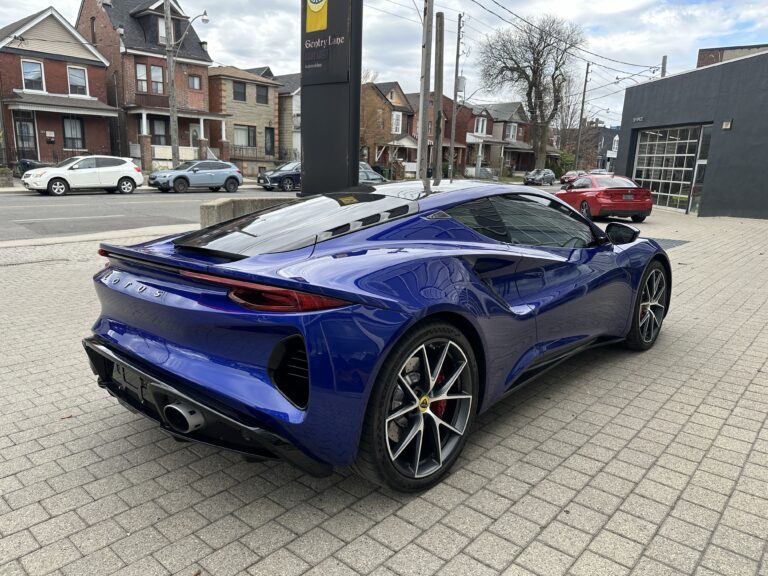 This 2024 Lotus Emira is a First Edition example that has around 1800 km and is powered by a supercharged 3.5-liter V6 mated to a six-speed manual transaxle and a limited-slip differential. It is finished in Atlantis Blue over Red Nappa leather . The car is also equipped with the Extended Black Pack, a valved exhaust system, 20″ forged wheels, LED headlights, a sport suspension, heated seats, and a KEF Uni-Q sound system.